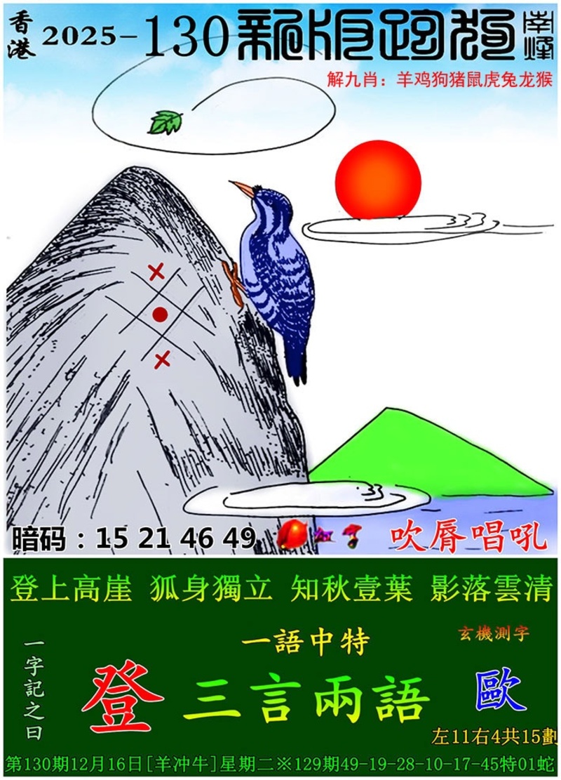 【130期跑狗图】 一字记之曰:【登】登上高崖,狐身獨立。 知秋壹葉,影落雲清。 玄機測字:《歐》 解:狐身獨立解独肖:鼠牛虎兔马羊。 解肖主前:鼠牛虎兔马羊 综合取码:06.30.29.41.04.28.15.27.12.36.11.35 |